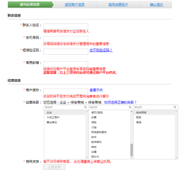②按照上面的提示填寫信息,*為必填,其他可以不填,特殊行業(yè)需要提供資質(zhì)證書(如食品、醫(yī)療等)