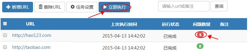 ???????步驟3:勾選url點(diǎn)擊“立即執(zhí)行”,運(yùn)行完成后顯示出問題數(shù)量,如下圖所示: