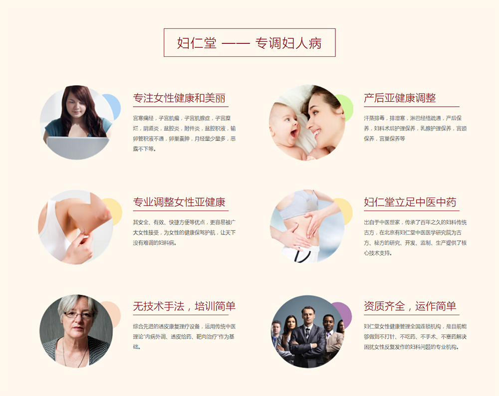 婦仁堂女性健康管理全國連鎖機(jī)構(gòu),結(jié)合先進(jìn)的透皮康復(fù)理療設(shè)備,運(yùn)用傳統(tǒng)中醫(yī)理論“內(nèi)病外調(diào)、透皮給藥、靶向治療”作為基礎(chǔ),是目前一家能夠做到不打針、不吃藥、不手術(shù)、不塞藥解決困擾女性反復(fù)發(fā)作的婦科問題的專業(yè)機(jī)構(gòu)。其安全、有效、快捷、方便等優(yōu)點(diǎn),更容易被廣大女性接受,為女性的健康護(hù)航。